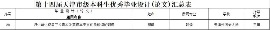 近日,天津市教委下发了《关于公布第十四届天津市级本科生优秀毕业设计(论文)评审结果的通知》,我校565net必赢翻译专业学生胡晴的论文“归化异化视角下《青衣》英译本中文化负载词的翻译”获评天津市级本科生优秀毕业设计(论文)。