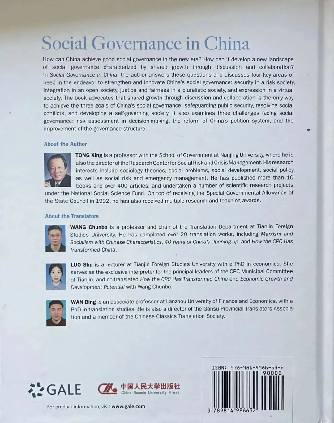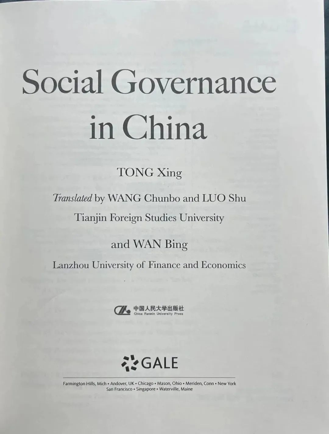 近日,由我校中国特色社会主义理论体系国际传播外译研究中心(以下简称“外译中心”)主任汪淳波教授、青年教师罗枢副教授承担翻译的《中国社会治理》英文版(Social Governance in China)由圣智集团盖尔公司在海外出版发行。