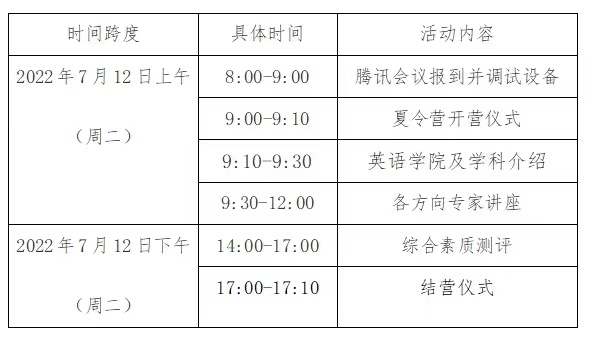 (1)夏令营活动安排在2022年7月12日进行,活动时间为1天。