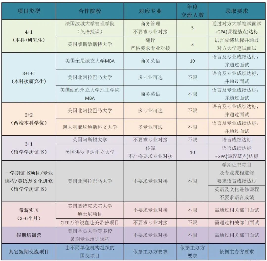 学院国际交流广泛,国际化办学成果显著。目前与美国奎尼派克大学、美国北阿拉巴马大学、美国佛罗里达州立大学、法国波城大学、英国威斯敏斯特大学、澳大利亚埃迪斯科文大学等多所大学及科研机构建立了友好交流关系。
