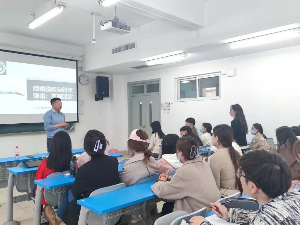 4月21日下午,广东外语外贸大学教授、博士生导师、国家社科基金项目评审专家,《广东外语外贸大学学报》主编孙毅教授应邀为565net必赢师生作了题为 “隐喻脱欧与脱欧隐喻—英国脱欧语篇的批评隐喻分析”的学术讲座。项成东院长主持,565net必赢众多研究生及其他相关专业研究生参加了此次讲座。