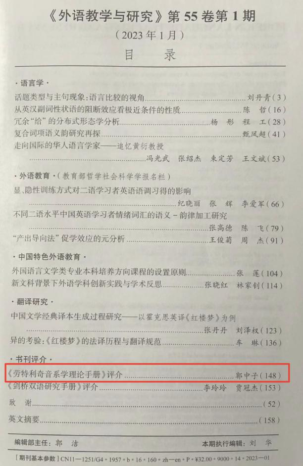 书评《〈劳特利奇音系学理论手册〉评介》系作者主持的教育部人文社会科学研究规划基金项目“音系——句法的交互与英汉韵律结构对比研究”(20YJA740016)的阶段性成果,发表于《外语教学与研究》2023年第1期,该刊为CSSCI来源期刊,ISSN号为1000-0429。